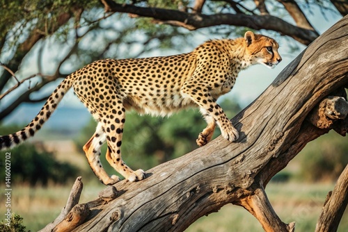 Cheetah gracefully descends a twisted tree in the savannah, showcasing agility and wild beauty