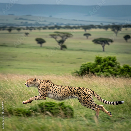 Cheetah in Full Sprint Across African Savannah | Fastest Land Animal Running Through Grasslands with Acacia Trees and Distant Hills in Wild Habitat
