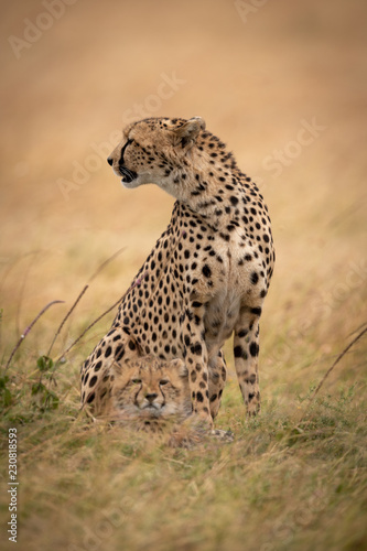 Cheetah sits with cub at her feet