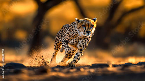 Cheetah sprinting at sunset in savanna
