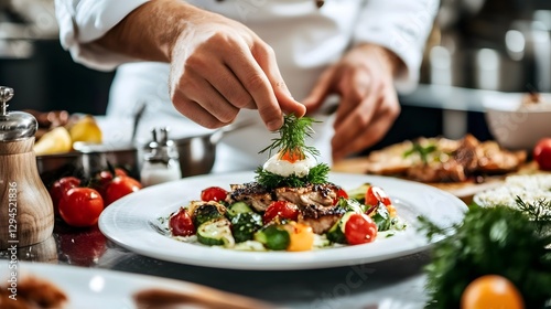 Chef Adding Final Garnish to Plated Culinary Dish in Restaurant Kitchen