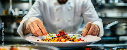 Chef Adding Final Touch to Colorful Gourmet Dish