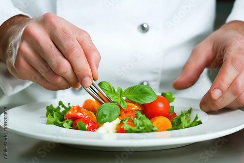 Chef adding herbs to fresh salad