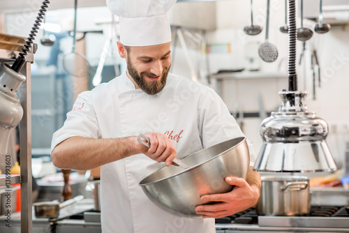 Chef cook in uniform mixing salad in the metal vessel at the restaurant kitchen