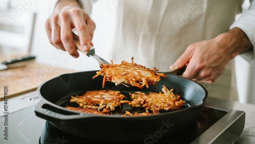 Chef cooking crispy golden potato pancakes from scratch in a cast iron skillet, frying delicious latkes on an induction cooktop as a healthy hot meal