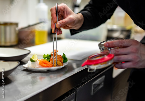 chef cooking slice salmon fish and shrimp with salad on kitchen