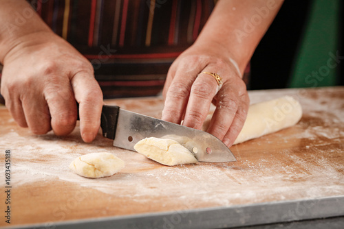 Chef Cutting Fresh Wheat Dough on Floured Cutting Board - Homemade Bread Making Process