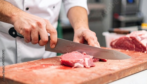 Chef Cutting Raw Meat On Wooden Board