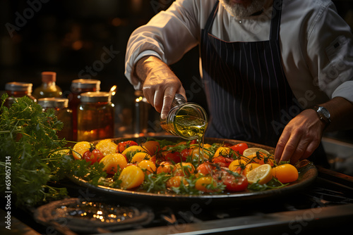 Chef drizzling golden olive oil over a sizzling pan of fresh ingredients.