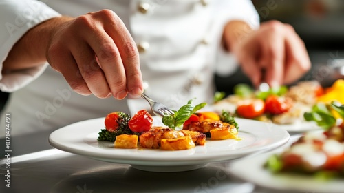 Chef Finishing a Plate with Grilled Fish, Tomatoes, and Basil