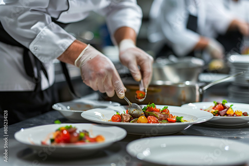 Chef garnishing a dish in a professional kitchen.