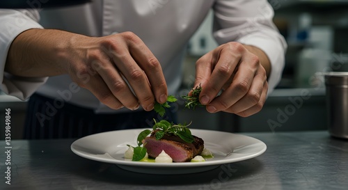 Chef Garnishing a Medium Rare Steak Dish with Fresh Herbs
