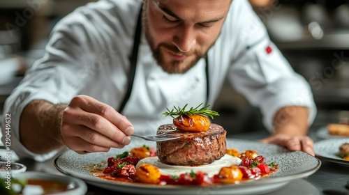 Chef garnishing gourmet steak dish with rosemary and tomatoes