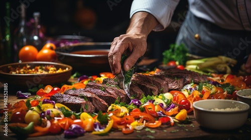 chef hand cooking meat salad with vegetables on restaurant kitchen.