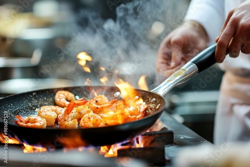 Chef hand in restaurant kitchen with pan, cooking flambe on shrimps , ai