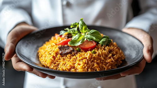Chef holding a plate of traditional Kabsa rice with vegetables, a vibrant and authentic Middle Eastern dish, perfect for food and culinary themes.