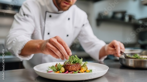 Chef in white uniform plating gourmet dish in restaurant kitchen culinary arts profession