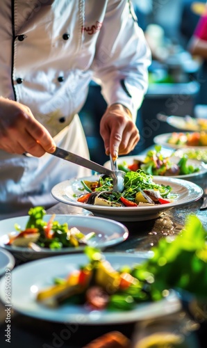 Chef Plating Colorful Salad in Restaurant Kitchen
