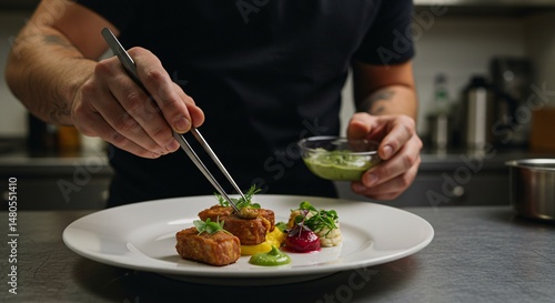 Chef plating gourmet dish, artistic presentation with fresh ingredients