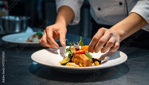 Chef plating gourmet dish in dark kitchen with spotlight on hands
