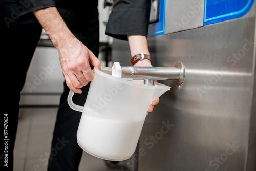 Chef pouring pasteurized milk into the jar for ice cream production