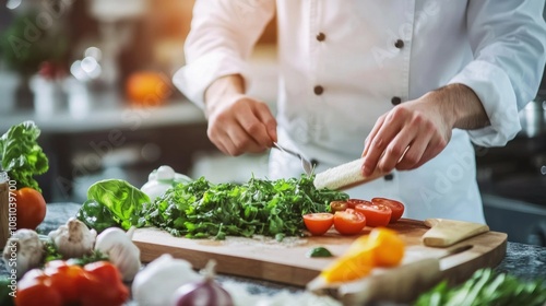 Chef preparing a delicious and healthy meal with fresh ingredients in a professional kitchen.