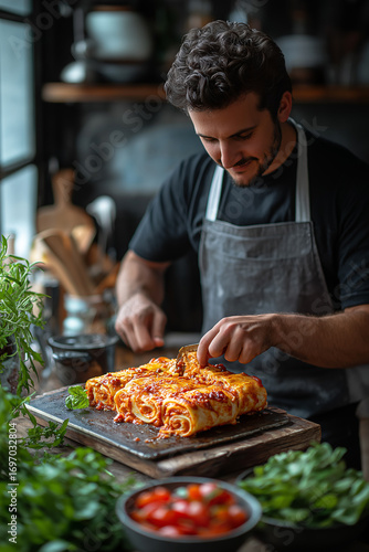 Chef preparing delicious homemade food in the kitchen with gourmet recipes and culinary skills