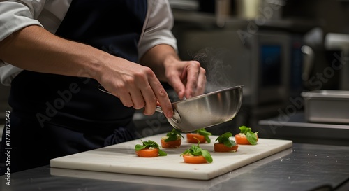 Chef preparing elegant gourmet dish with precision in modern professional kitchen environment