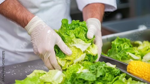 Chef preparing fresh lettuce with care.