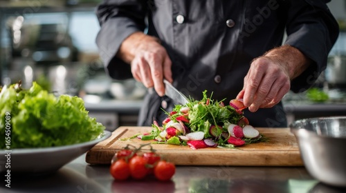 Chef Preparing Fresh Vegetable Salad with Radishes and Greens