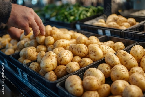 Chef selecting fresh potatoes at farmers market, supporting local agriculture