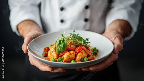 Chef serving gourmet chicken dish with vibrant vegetables and fresh basil in elegant white plate