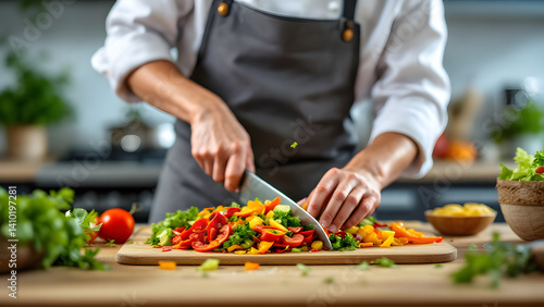 Chef skillfully cutting fresh vegetables on wooden board in bright kitchen