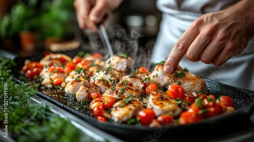 Chef slicing grilled chicken breast with cherry tomatoes.