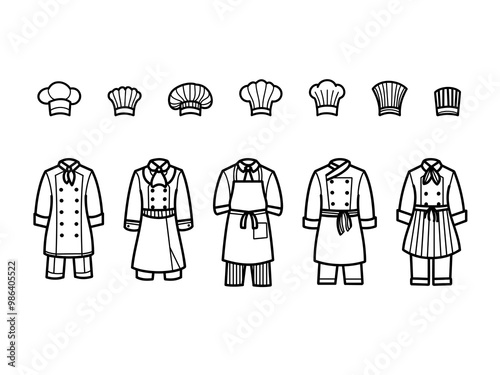 Chef uniforms and hats line art collection, black and white hand drawn outfits with details, clean and minimal line art style, vector illustration.