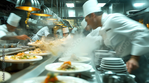 Chefs in a restaurant kitchen work diligently, plating meals and preparing dishes. Steam rises from the food as the chefs prepare plates for customers - Generative AI
