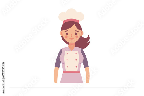 Chef's Pride: A friendly female chef stands confidently, embodying culinary expertise, in this charming, flat illustration. It's a delightful representation of the culinary world.