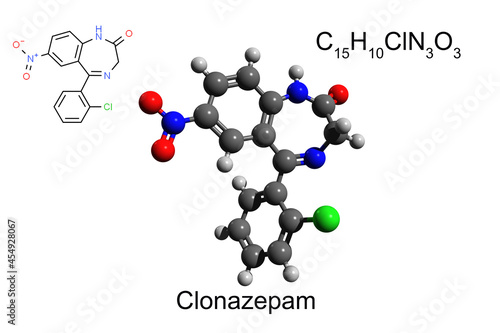 Chemical formula, skeletal formula, and 3D ball-and-stick model of benzodiazepine medication clonazepam, white background