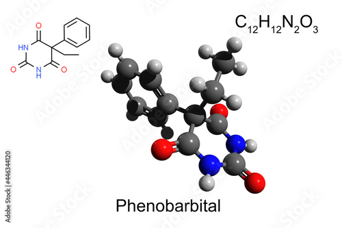 Chemical formula, skeletal formula, and 3D ball-and-stick model of medication phenobarbital, white background