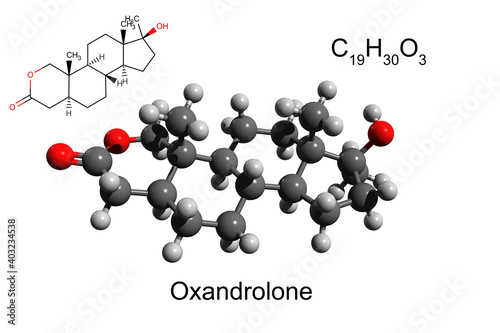 Chemical formula, structural formula and 3D ball-and-stick model of anabolic steroid oxandrolone, white background
