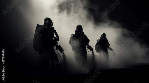 chemical gas attack imitation. silhouettes of people in gas masks black and white fog and smoke.