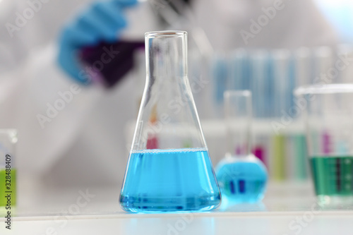 Chemical industry bulb with blue magenta pink liquid lab tubes stand on the table in the laboratory of liquid testing test development substances poisons additives stabilizers flavors house cleaning.