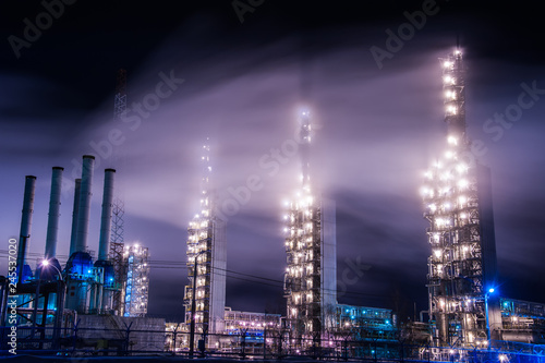 Chemical industry distillation towers detail at night. Petrochemical background. Long exposure at winter dusk.