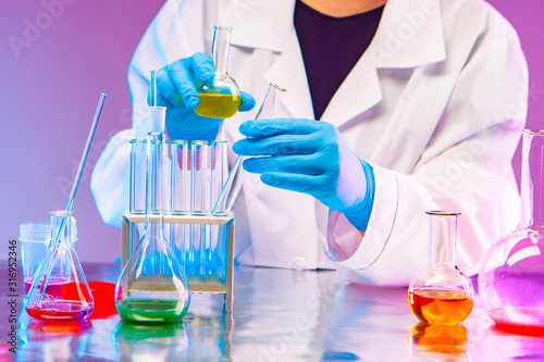 Chemical laboratory. A man in protective gloves works with test tubes. Laboratory assistant works with chemicals. Human holds test tubes in his hands.Man in a chemistry lab. Scientific research.
