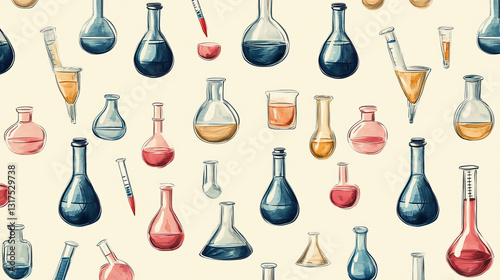 Chemical laboratory flask glassware tube liquid biotechnology analysis and medical scientific equipment chemistry seamless pattern vector illustration.