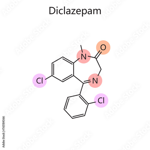 Chemical organic formula of Diclazepam diagram hand drawn schematic vector illustration. Medical science educational illustration
