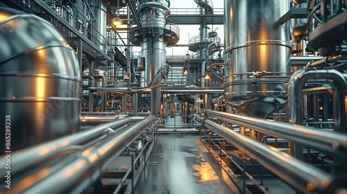 Chemical production factory, realistic, industrial, silver, grey. Generative AI.