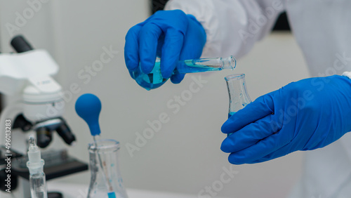 chemistry experiment and test tube in hand in science class on table Scientist education concept with glass flask in laboratory research and development concept