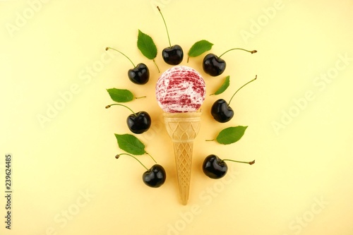 Cherry Bath Bomb.Pink striped bombs for a bath in a waffle cup and ripe sweet cherry berries on light yellow background. cosmetics with sweet cherry extract