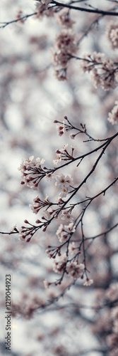 Cherry blossom branches in delicate bloom against a soft focus background creating a serene atmosphere
